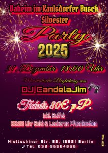 Feiern Sie gemeinsam mit uns ins neue Jahr mit großem Buffet, feinster Musik von DJ Candela Jim sowie Spiel und Spaß.